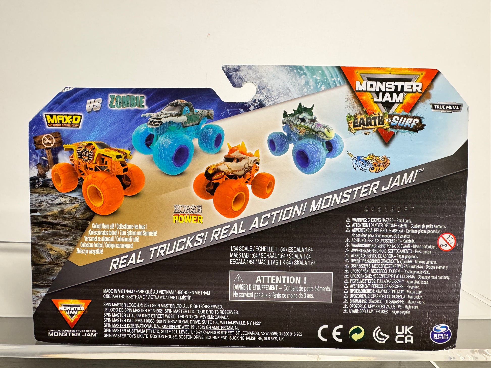 The Max-D vs Zombie Earth & Surf two-pack features two Monster Jam trucks with contrasting land and sea themed designs.